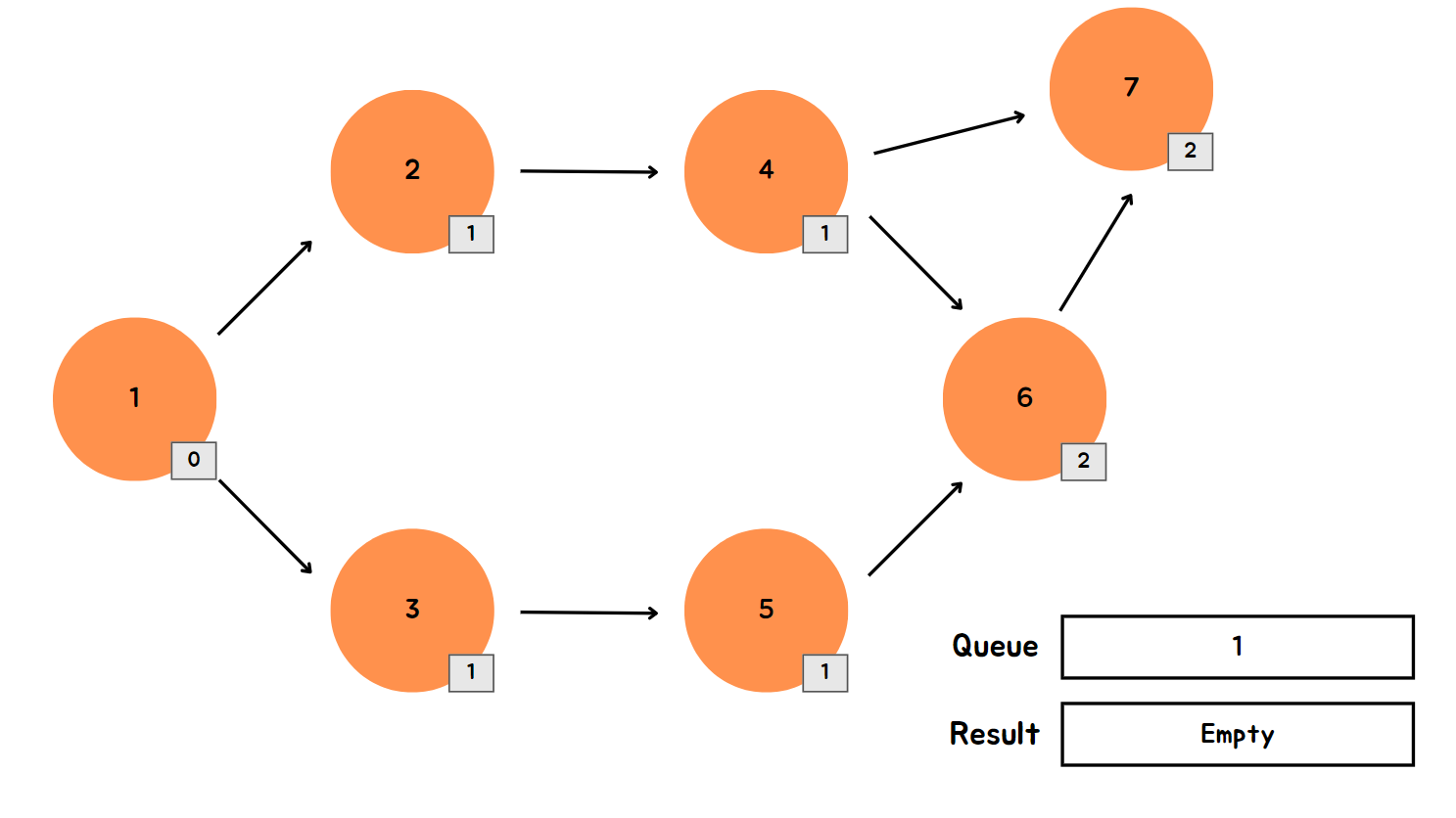 1. 맨 처음 indegree 값이 0인 노드들을 Queue에 담고 시작한다.