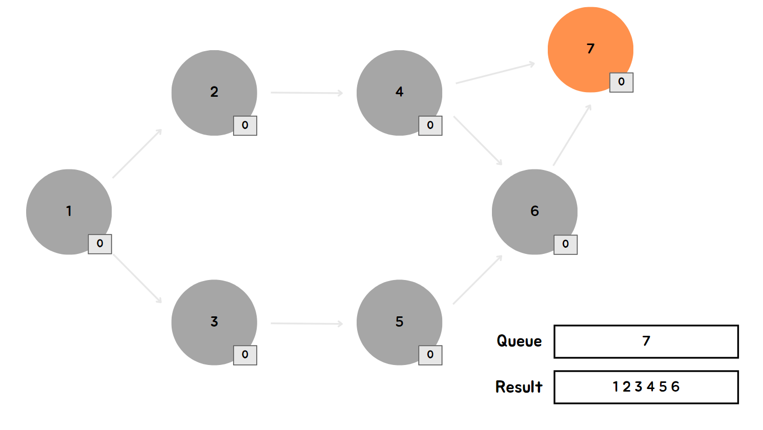 그리고 7 노드의 indegree가 0이 됐으므로 Queue에 7를 추가해준다.