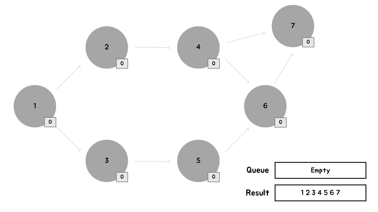 최종적으로 Queue는 비워지고 Result에 들어간 순서가 위상 정렬된 결과값이다.