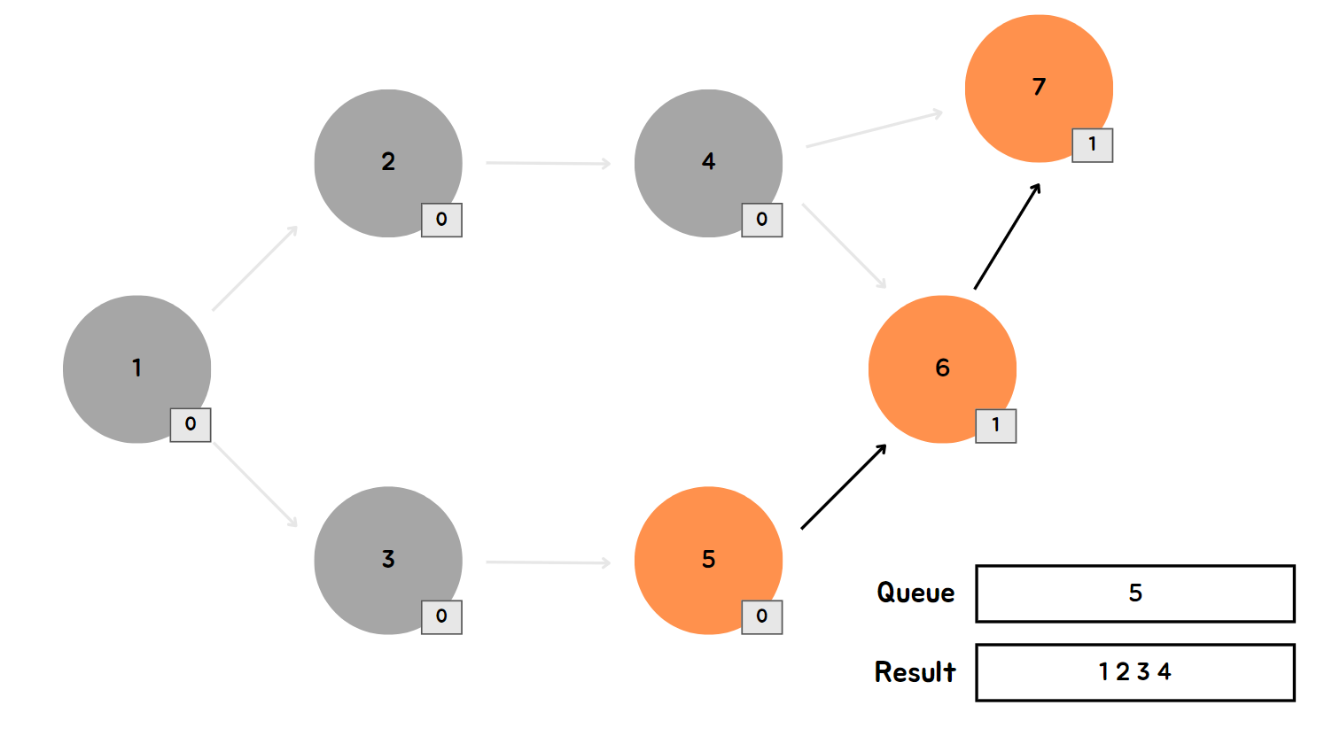 그리고 5 노드의 indegree가 0이 됐으므로 Queue에 5를 추가해준다.