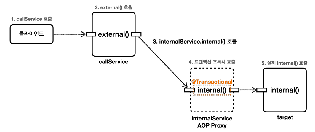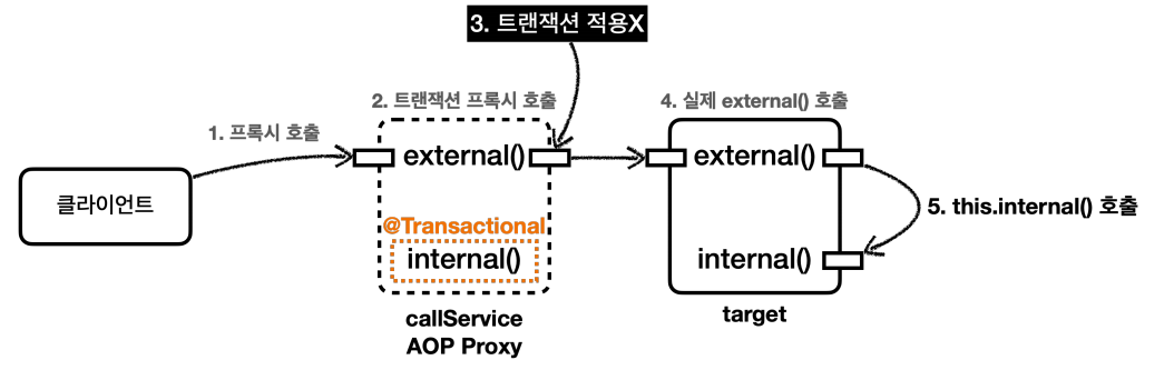 결과적으로 자기 자신의 내부 메서드를 호출하는 this.internal() 이 되는데, 여기서 this 는 자기 자신을 가리키므로, 실제 대상 객체( target )의 인스턴스를 뜻한다. 결과적으로 이러한 내부 호출은 프록시를 거치지 않는다. 따라서 트랜잭션을 적용할 수 없다. 결과적으로 target 에 있는 internal() 을 직접 호출하게 된 것이다.
