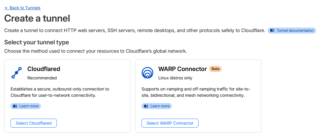 대시보드에서 Zero Trust -> Networks -> Connectors -> Create a tunnel