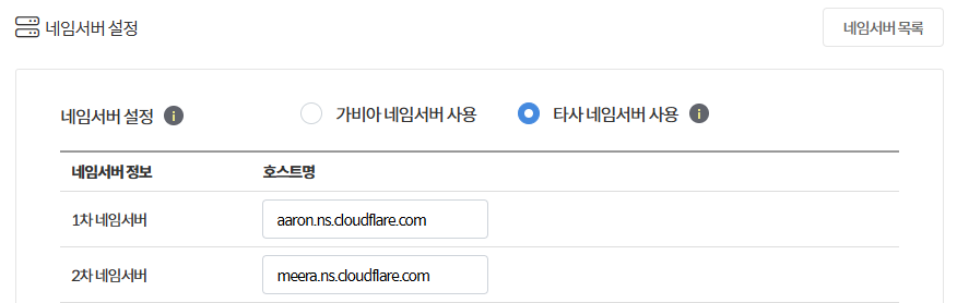 등록할 네임서버는 cloudflare에 사이트 등록을 완료하면 친절히 변경 방법을 알려준다.