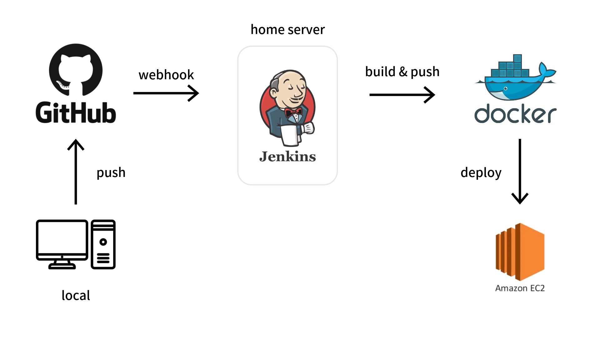 - Deploy (AWS EC2): 젠킨스가 AWS EC2에 SSH로 접속하여 최신 이미지를 받아와 실행한다.